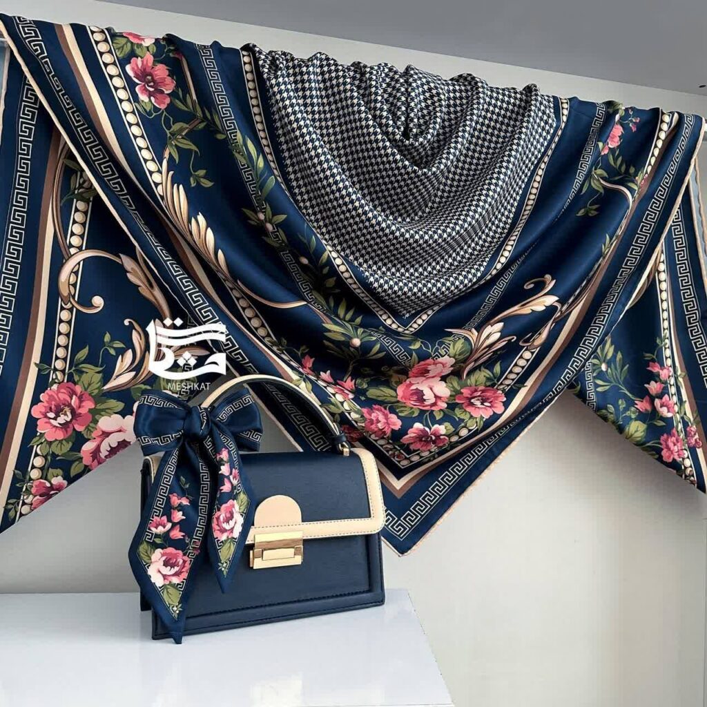 ست کیف وروسری ابریشم توییل طرح پرنیان سرمه ای